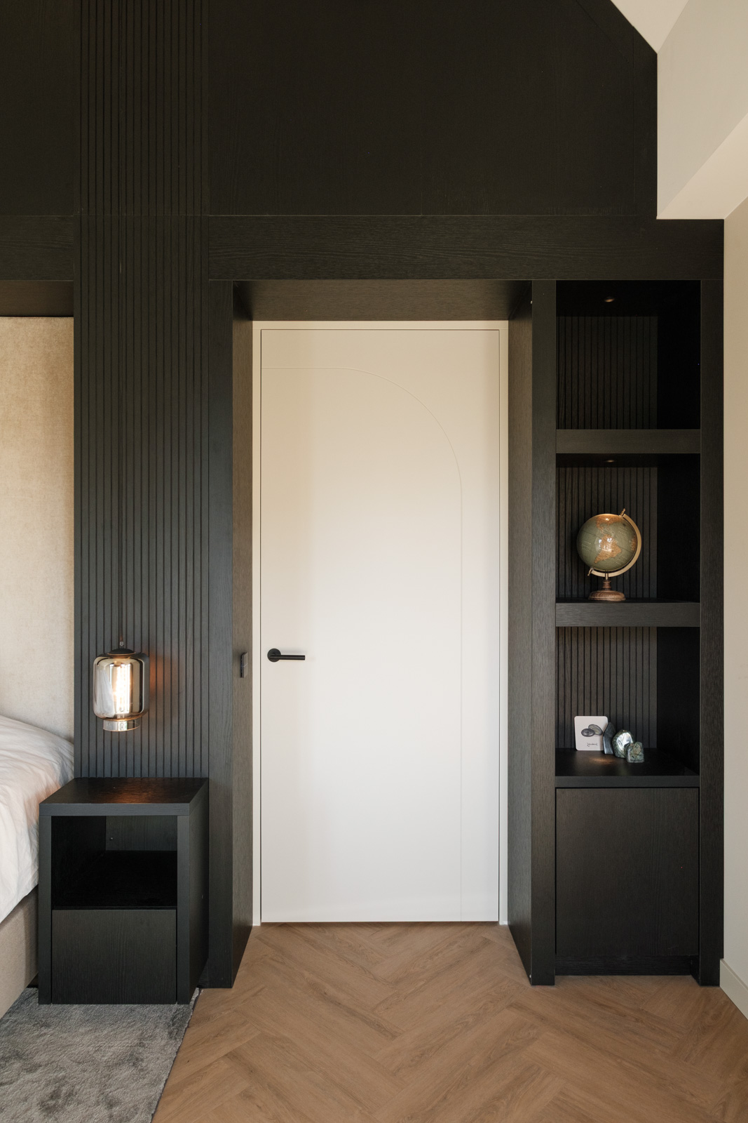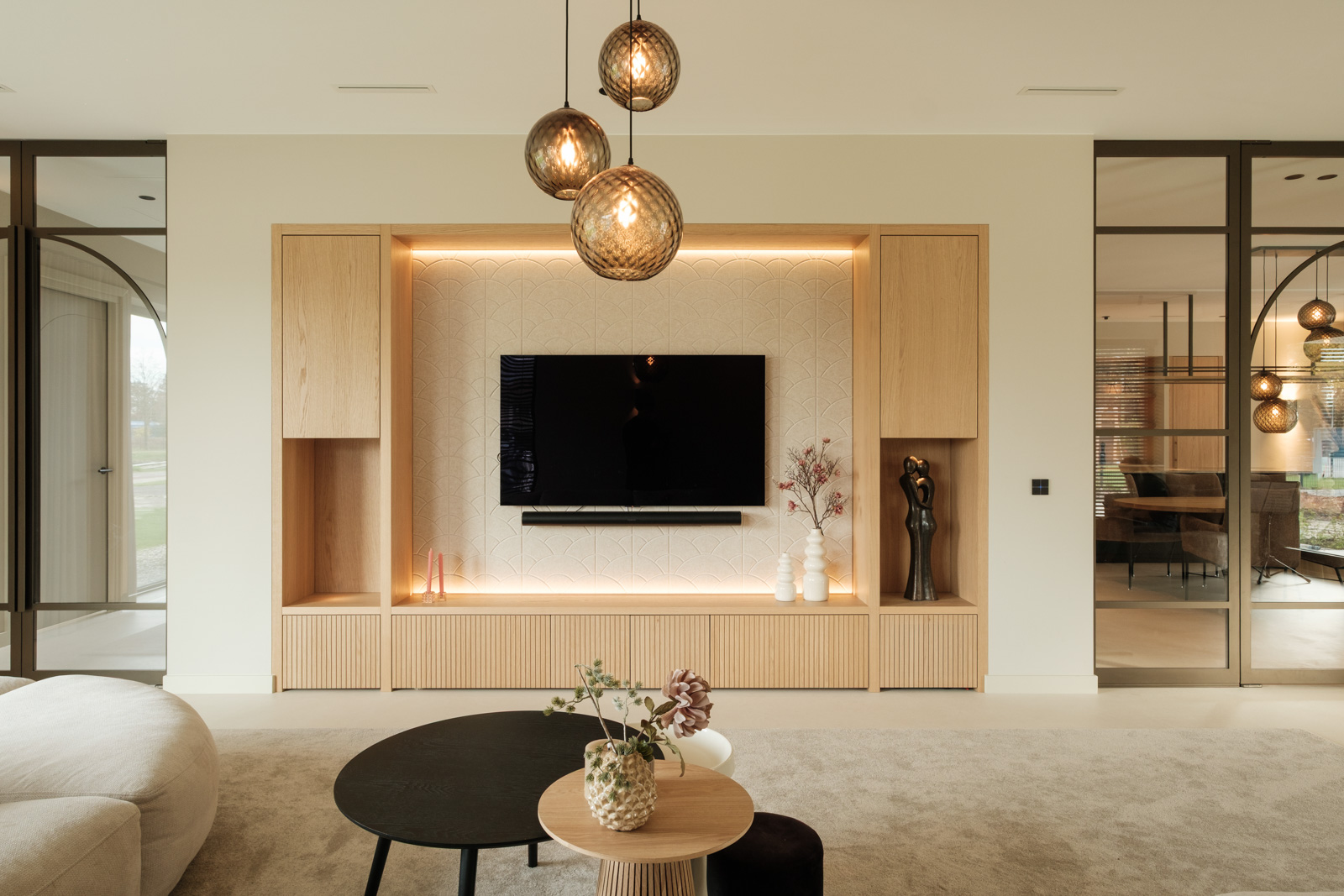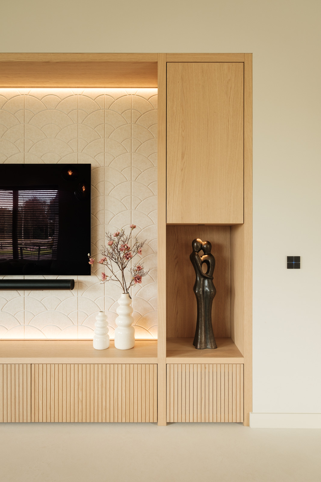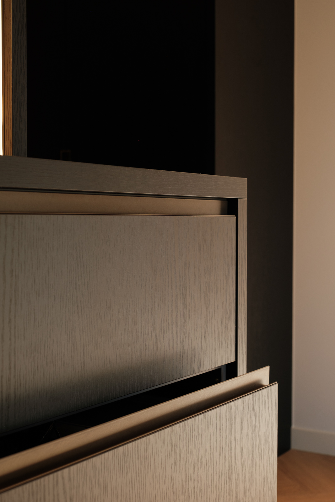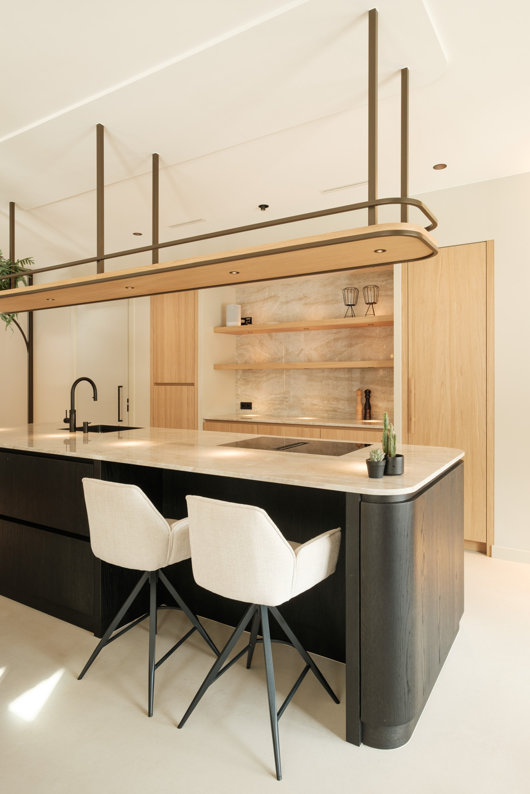 "Contrast bleek de rode draad voor dit ontwerp.", vertelt onze ontwerper Mariëlle. Voor deze woning mochten we het ontwerp en de realisatie van het maatwerk uitvoeren. Het ontwerp is een combinatie van frisse lichte en sfeervolle donkere kleuren en materialen. Mariëlle: “Ons uitgangspunt in het ontwerpproces was om met materialen een eenheid te vormen en zo bepaalde details in verschillende elementen van de woning terug te brengen.” Van de frisse badkamer tot aan de stijlvolle televisiewand; of je nu in een chique of stoere ruimte bent, met deze terugkerende elementen wordt dit project niet zomaar een verzameling kamers. Het wordt één geheel, een thuis.