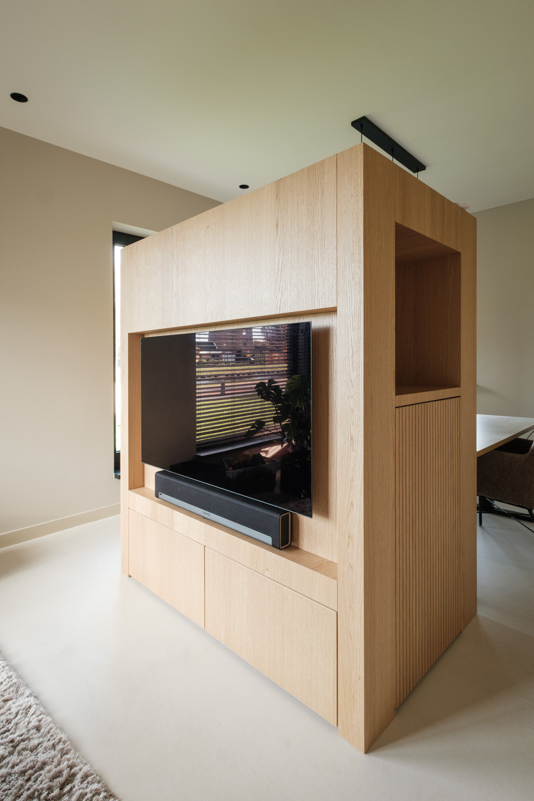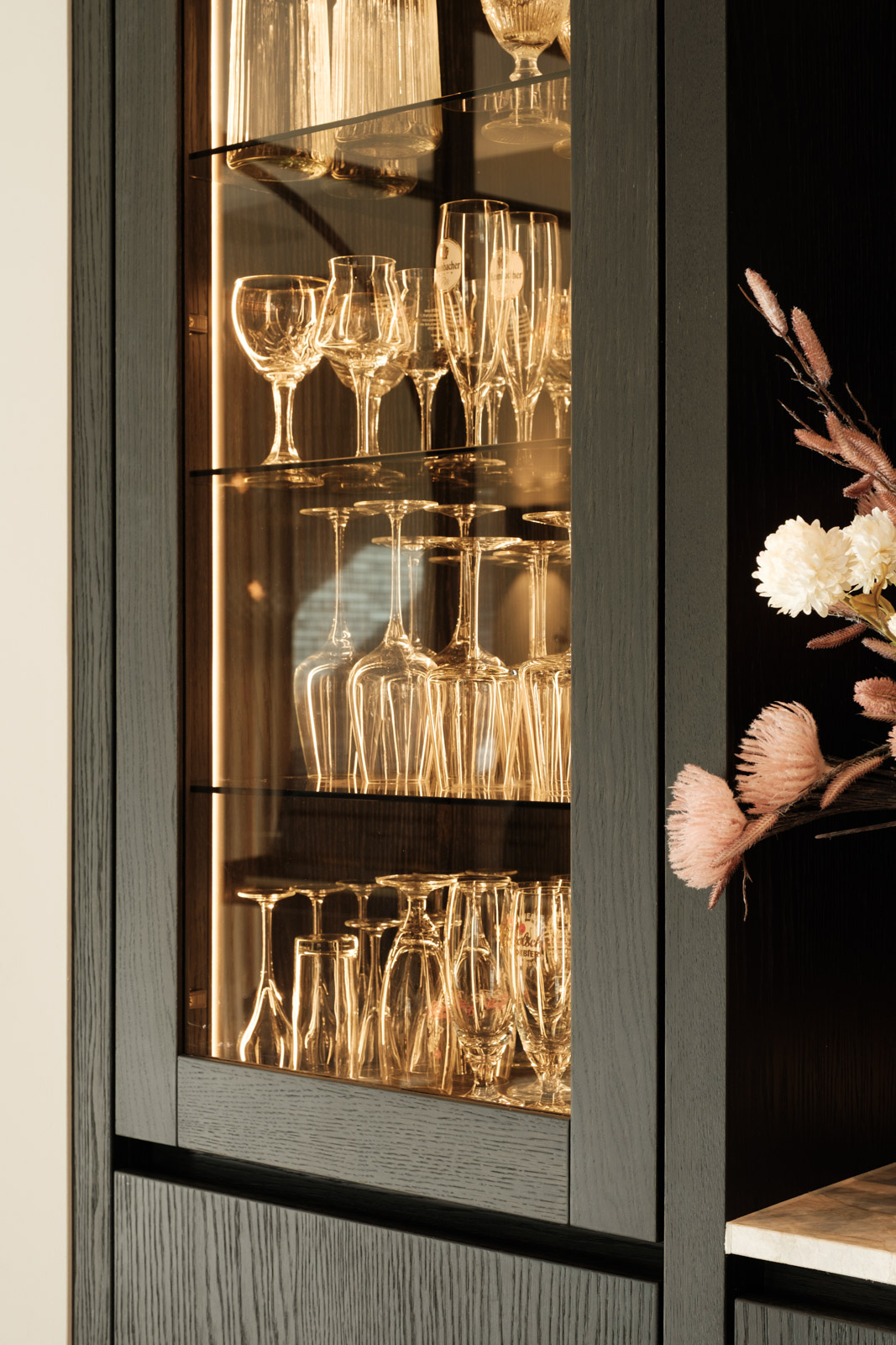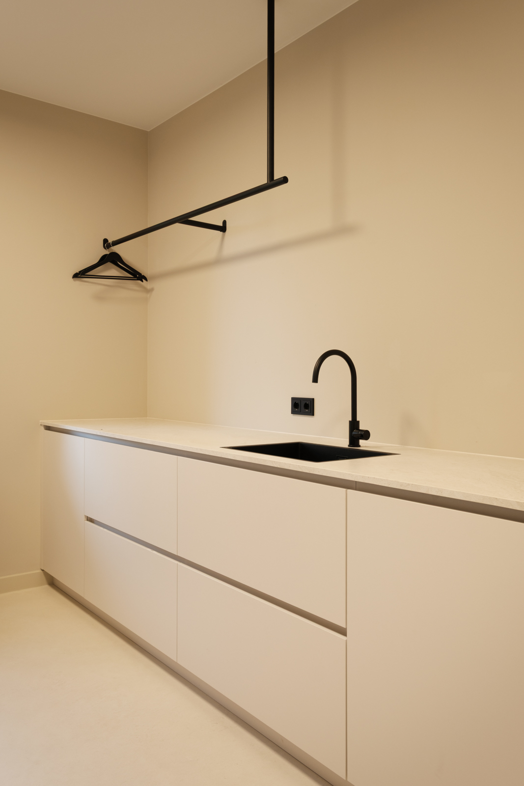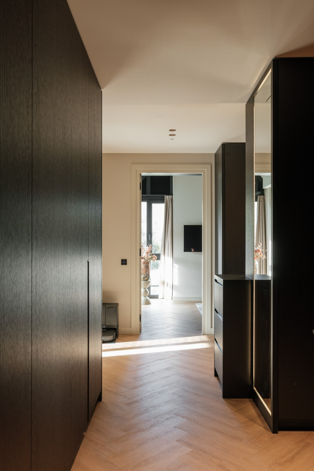 "Contrast bleek de rode draad voor dit ontwerp.", vertelt onze ontwerper Mariëlle. Voor deze woning mochten we het ontwerp en de realisatie van het maatwerk uitvoeren. Het ontwerp is een combinatie van frisse lichte en sfeervolle donkere kleuren en materialen. Mariëlle: “Ons uitgangspunt in het ontwerpproces was om met materialen een eenheid te vormen en zo bepaalde details in verschillende elementen van de woning terug te brengen.” Van de frisse badkamer tot aan de stijlvolle televisiewand; of je nu in een chique of stoere ruimte bent, met deze terugkerende elementen wordt dit project niet zomaar een verzameling kamers. Het wordt één geheel, een thuis.