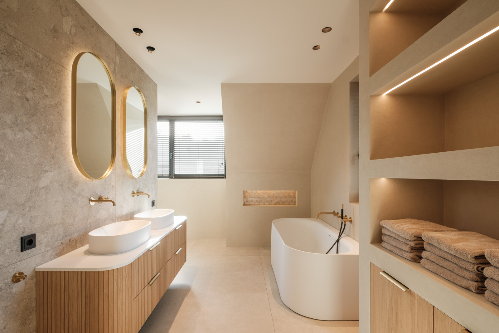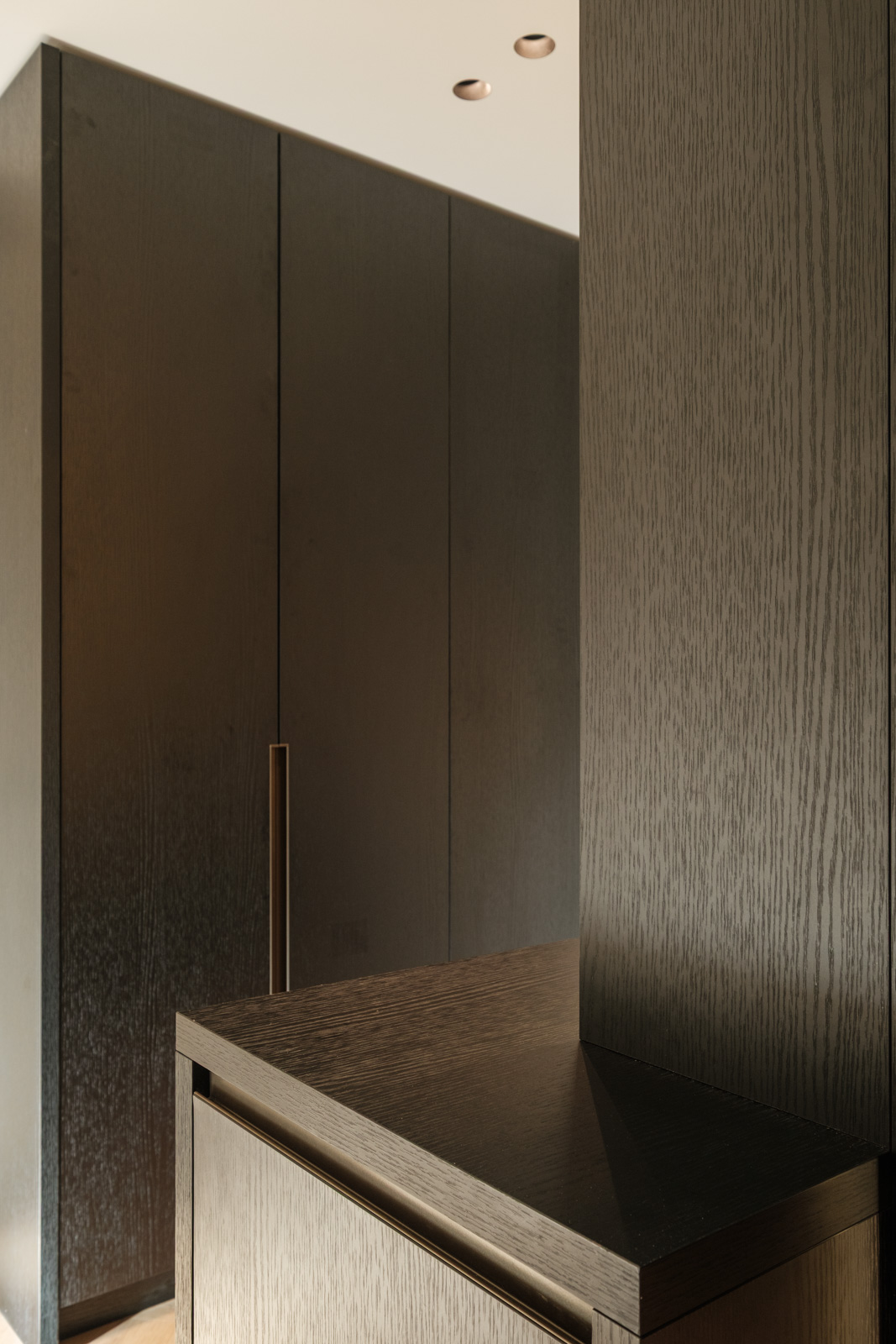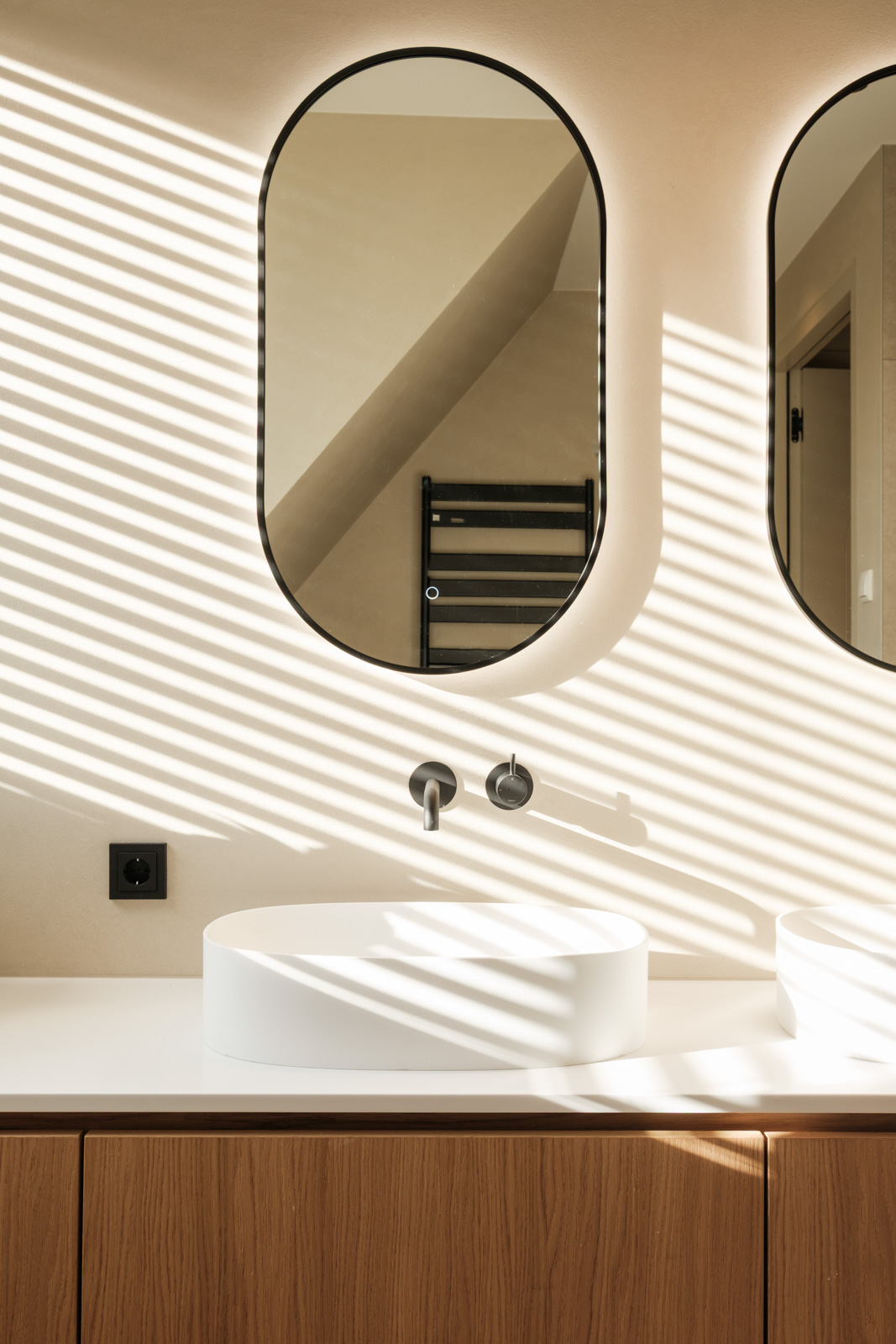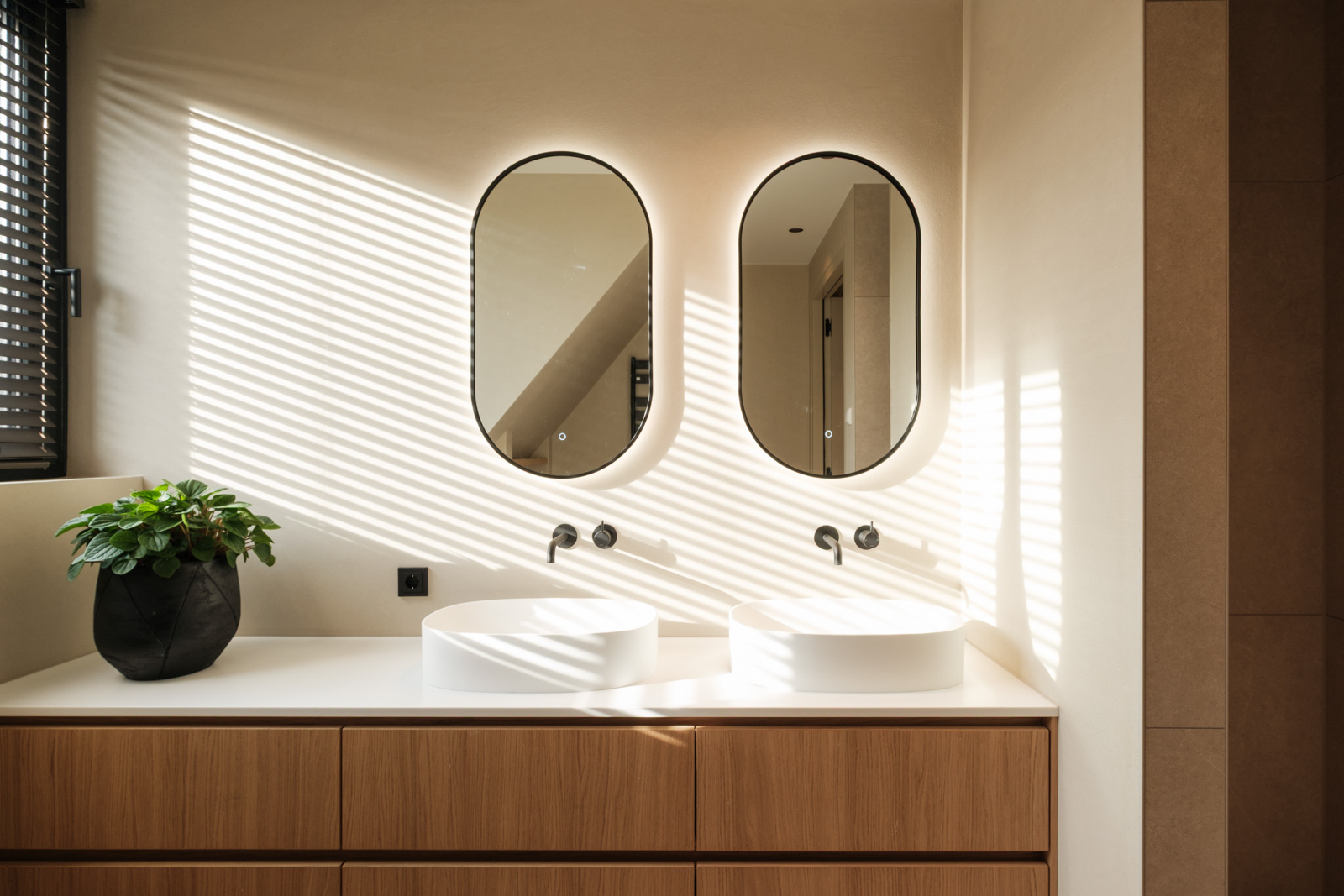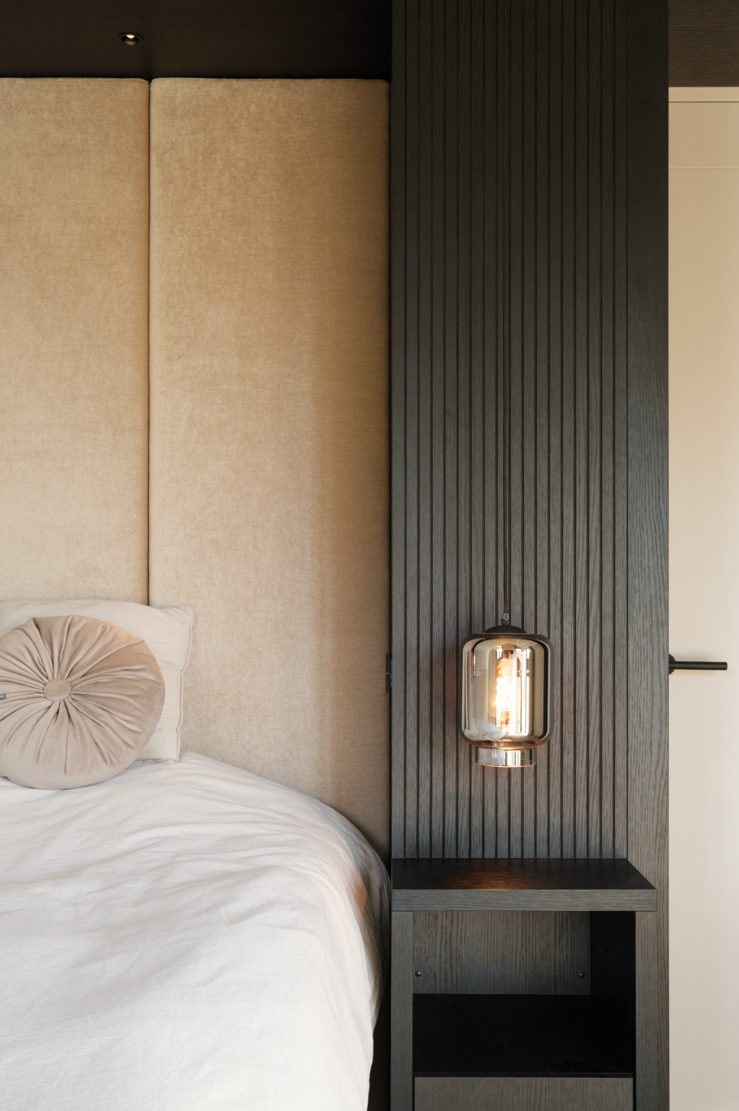 "Contrast bleek de rode draad voor dit ontwerp.", vertelt onze ontwerper Mariëlle. Voor deze woning mochten we het ontwerp en de realisatie van het maatwerk uitvoeren. Het ontwerp is een combinatie van frisse lichte en sfeervolle donkere kleuren en materialen. Mariëlle: “Ons uitgangspunt in het ontwerpproces was om met materialen een eenheid te vormen en zo bepaalde details in verschillende elementen van de woning terug te brengen.” Van de frisse badkamer tot aan de stijlvolle televisiewand; of je nu in een chique of stoere ruimte bent, met deze terugkerende elementen wordt dit project niet zomaar een verzameling kamers. Het wordt één geheel, een thuis.