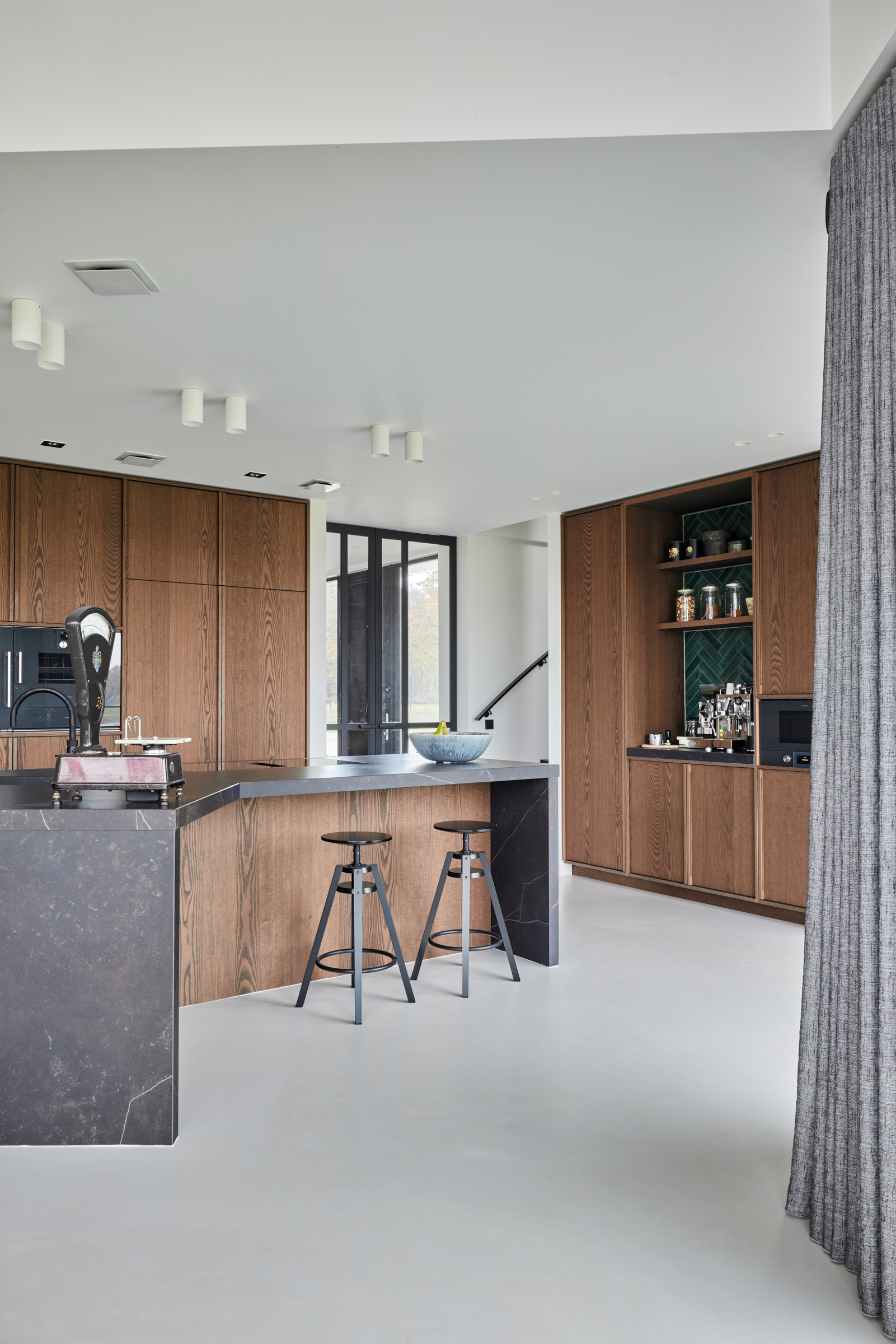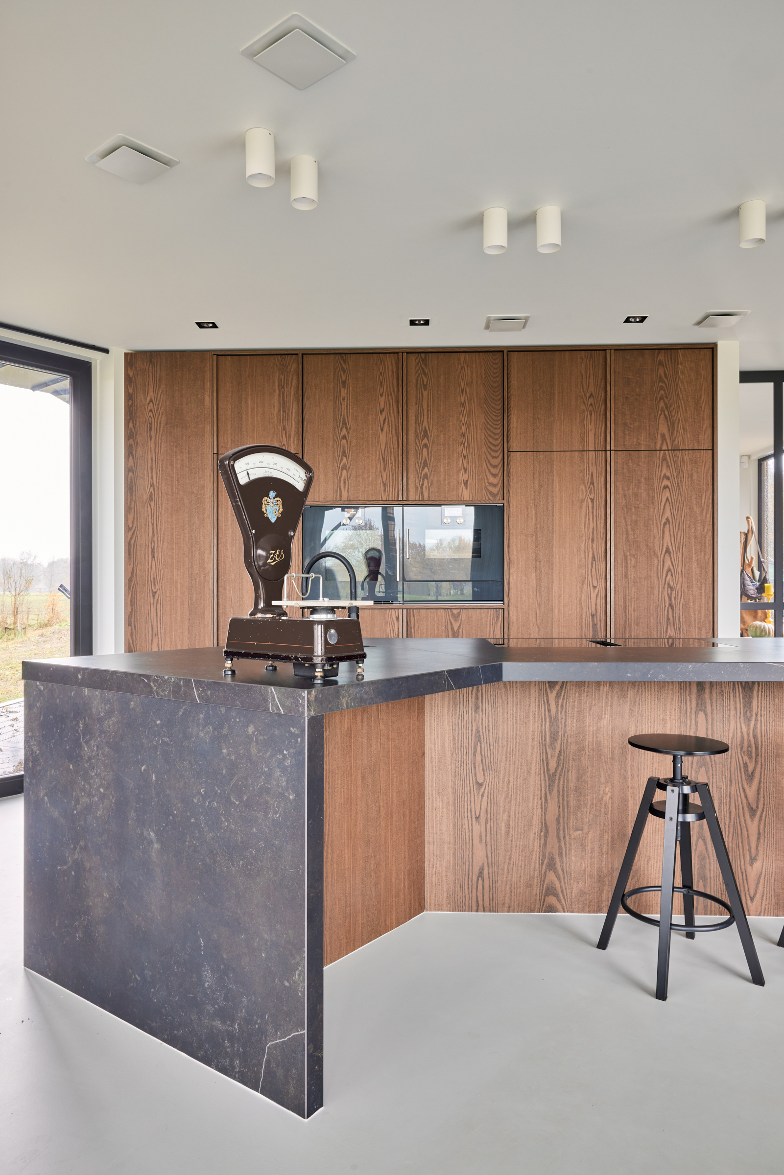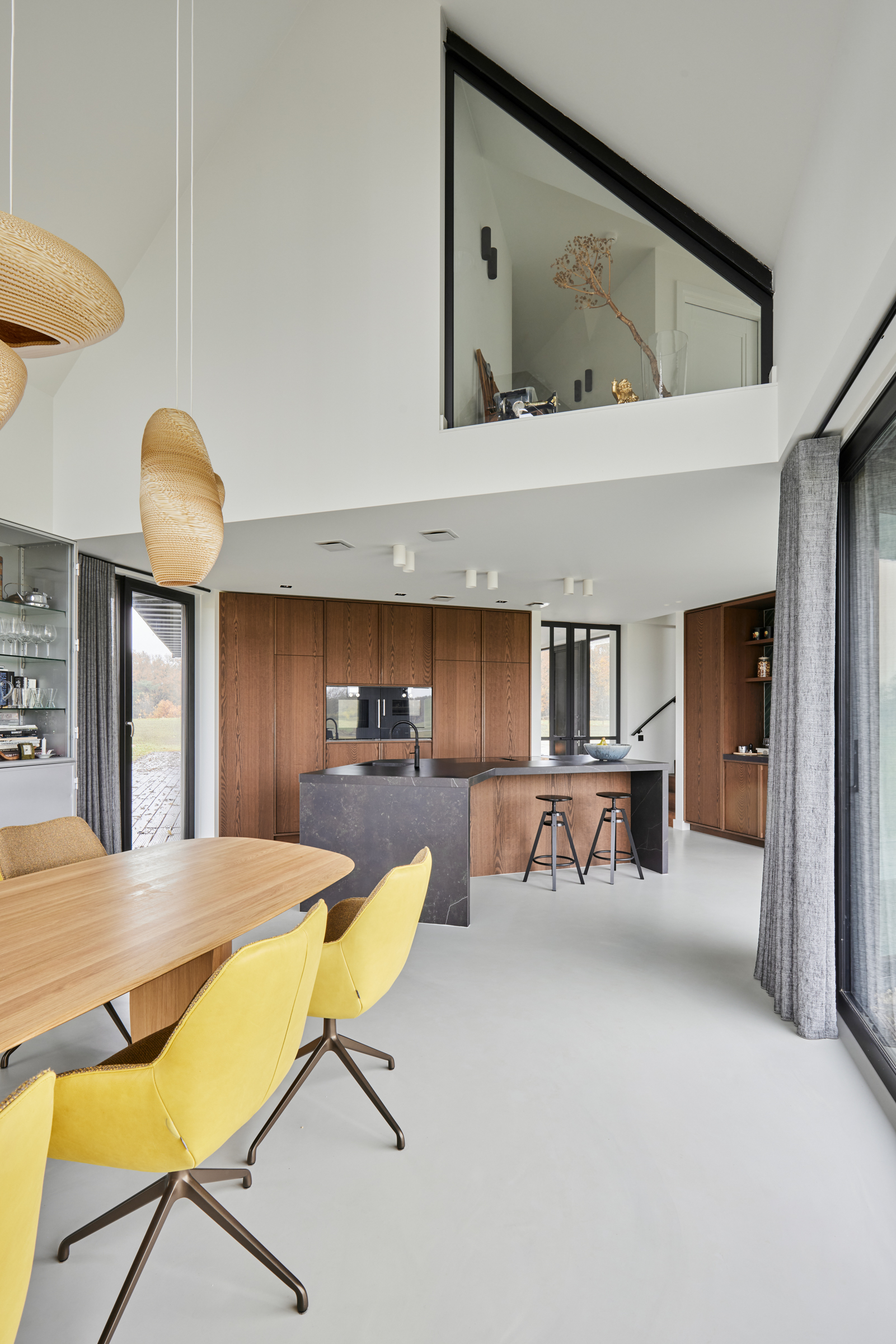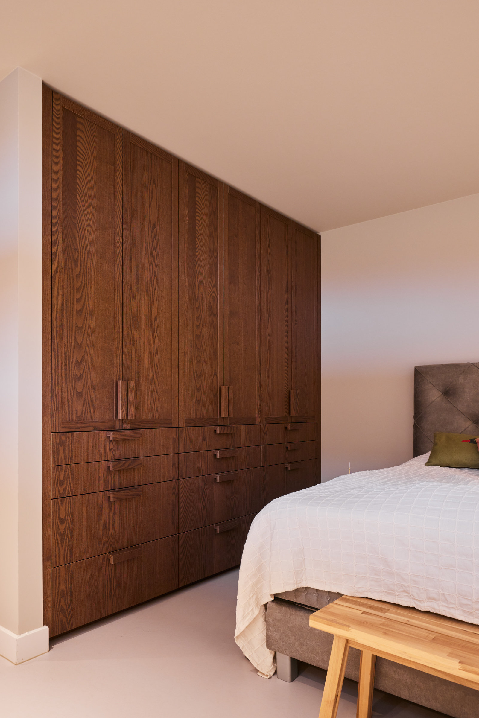 Een bijzondere woning, volledig ingericht met stijlvol interieur. Het bijzondere keukeneiland sluit perfect aan bij de unieke vorm van de woning. Met subtiele houten kopgrepen als elegant detail. Grote garderobekasten - bekleed met webbing materiaal - geven de slaapkamer een natuurlijke uitstraling. Maatwerk onder de schuine kanten benut elke centimeter optimaal. Met strakke, lichte kasten die perfect passen bij de vorm van de ruimte. De minimalistische trap met houten treden en zwart staal vormt een stijlvol accent. En dat terwijl de luxe badkamer met aardse tinten, organische vormen en verfijnde details rust en harmonie uitstralen.