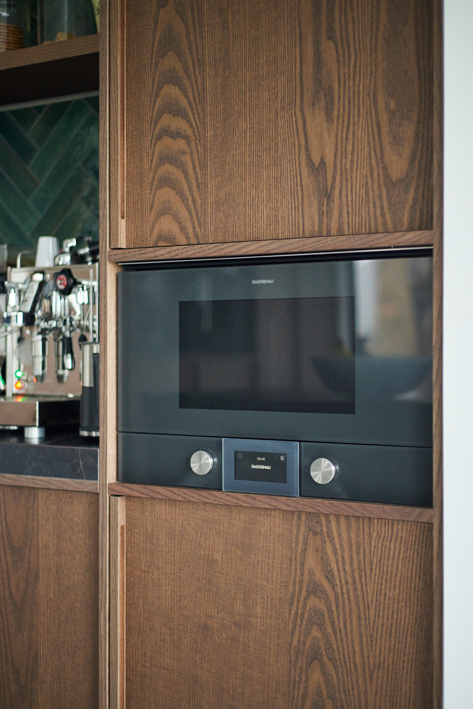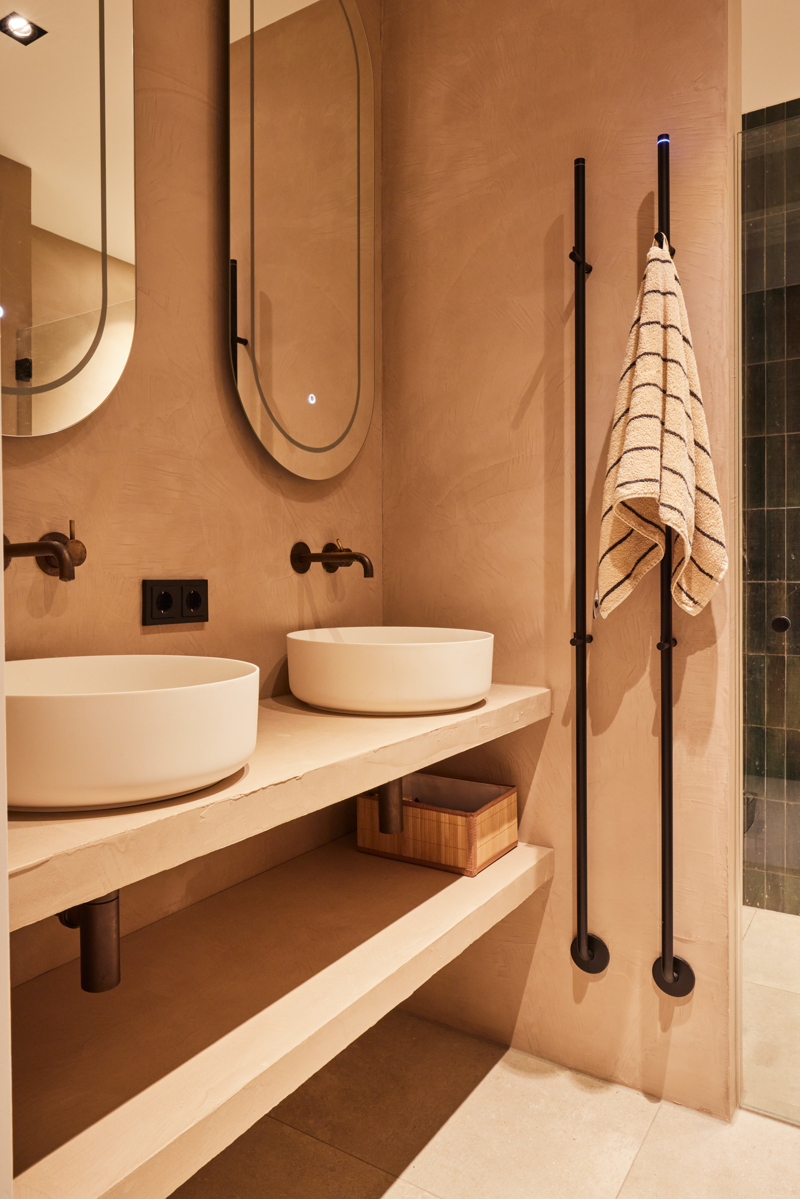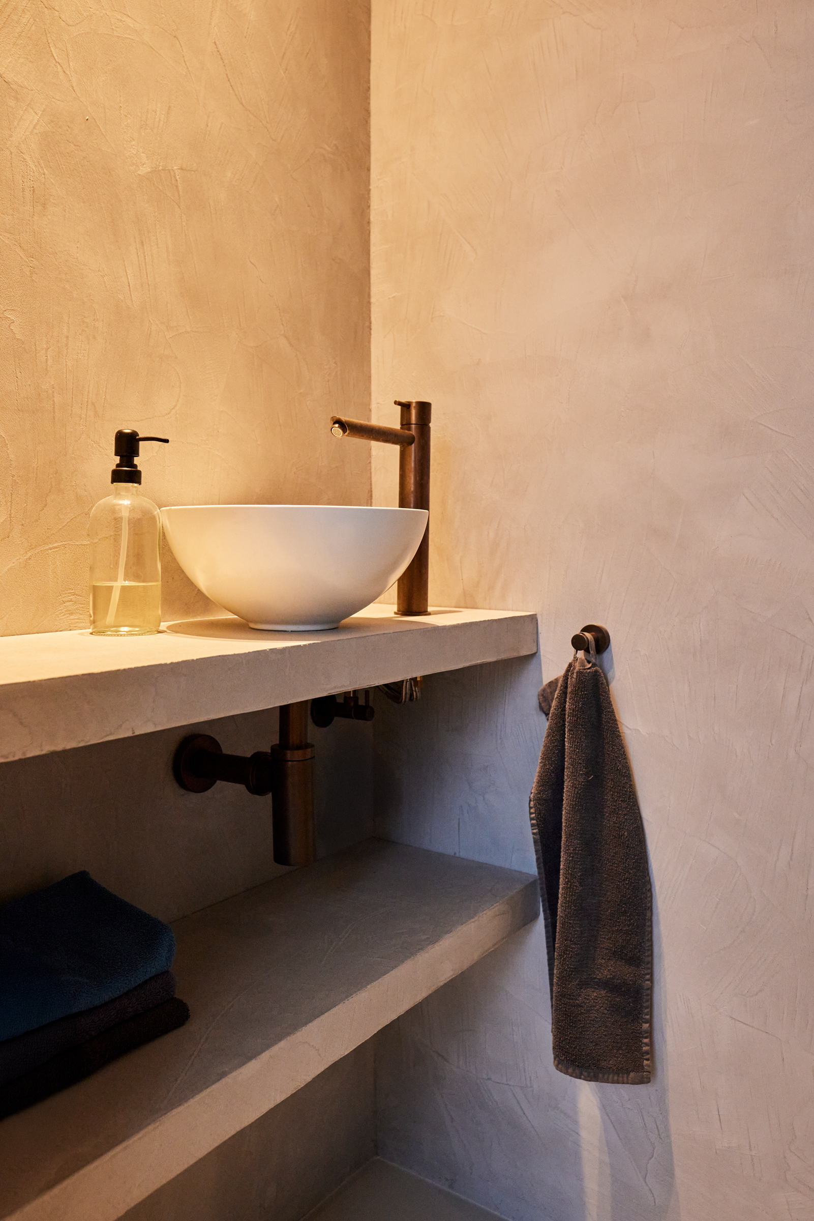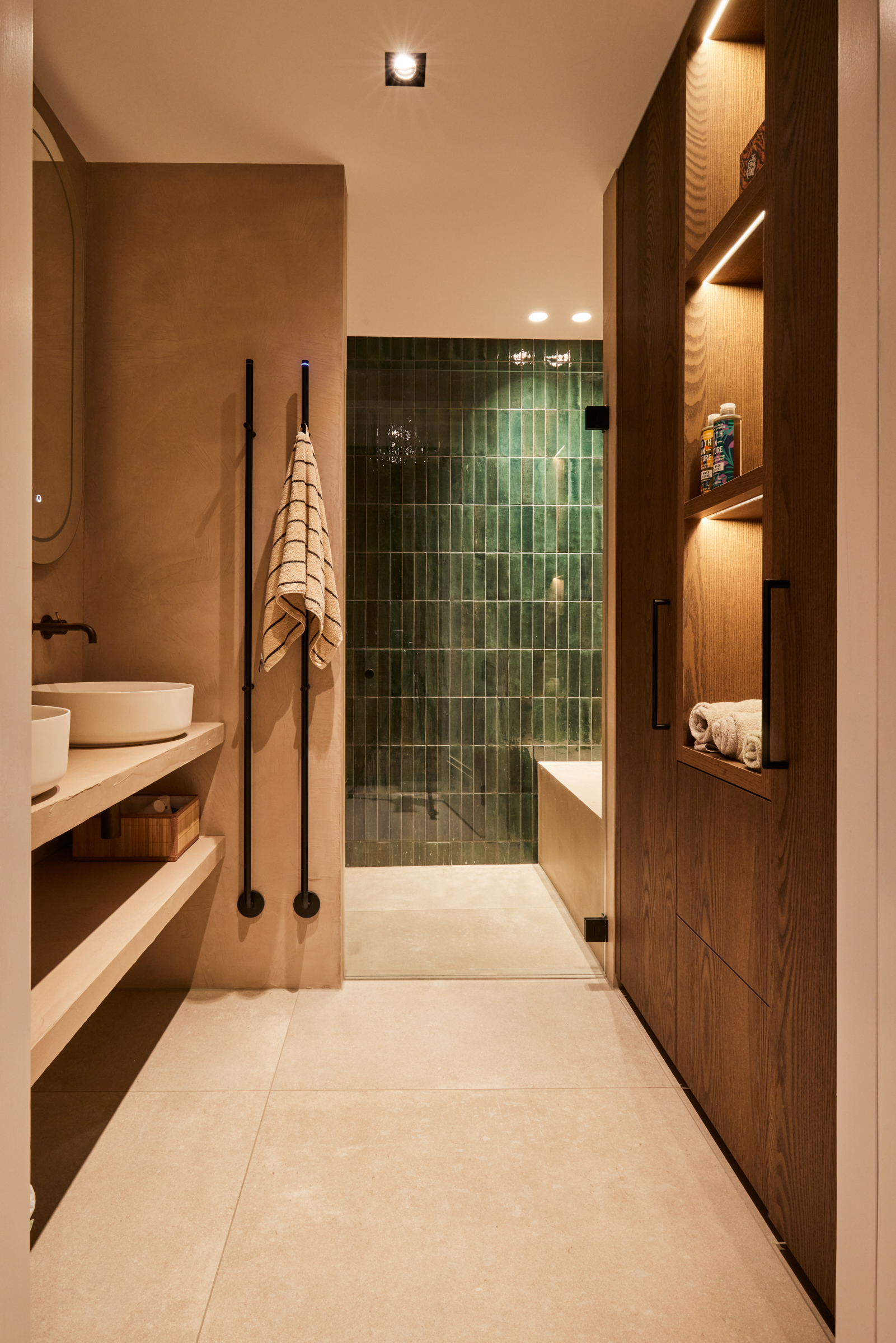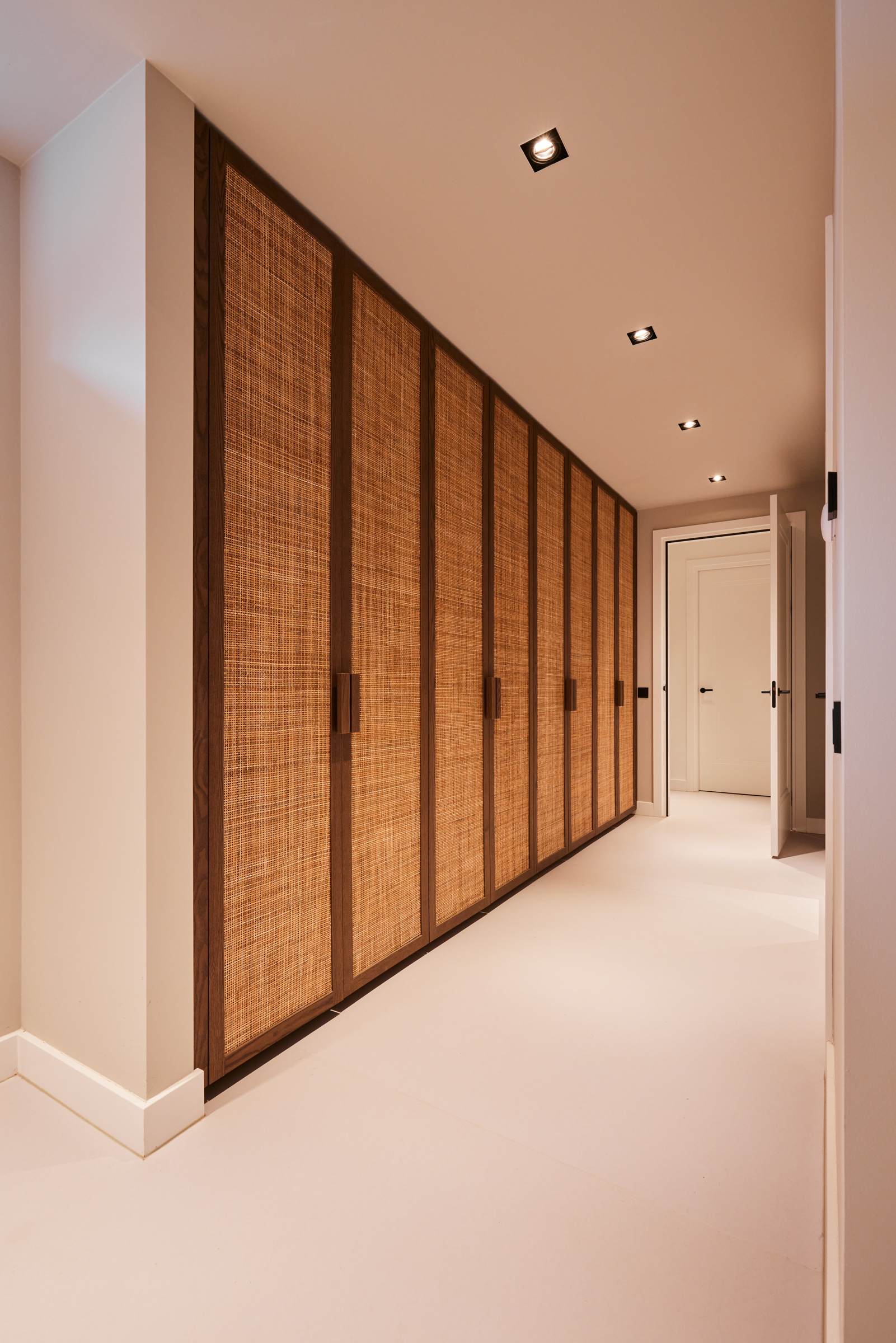 Een bijzondere woning, volledig ingericht met stijlvol interieur. Het bijzondere keukeneiland sluit perfect aan bij de unieke vorm van de woning. Met subtiele houten kopgrepen als elegant detail. Grote garderobekasten - bekleed met webbing materiaal - geven de slaapkamer een natuurlijke uitstraling. Maatwerk onder de schuine kanten benut elke centimeter optimaal. Met strakke, lichte kasten die perfect passen bij de vorm van de ruimte. De minimalistische trap met houten treden en zwart staal vormt een stijlvol accent. En dat terwijl de luxe badkamer met aardse tinten, organische vormen en verfijnde details rust en harmonie uitstralen.